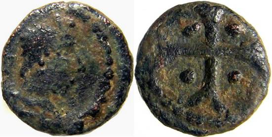 Cross potent with chevrons at the end of each arm. Four pellets between each arm and dotted border. |