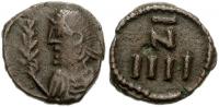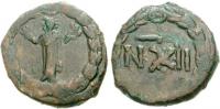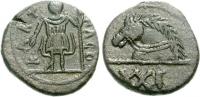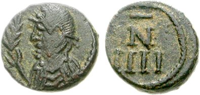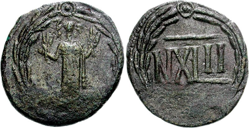 Karthago standing facing, holding three grain ears in each raised hand; all within laurel wreath |