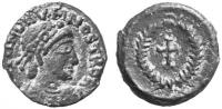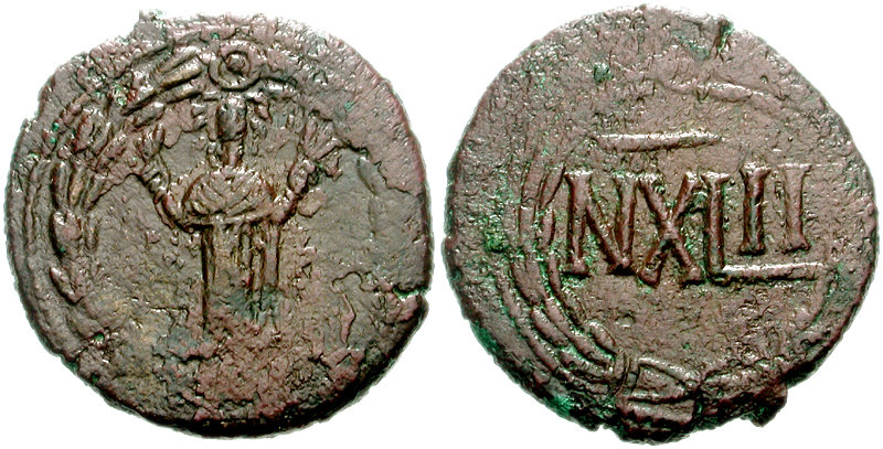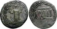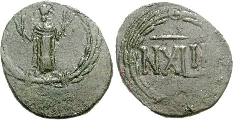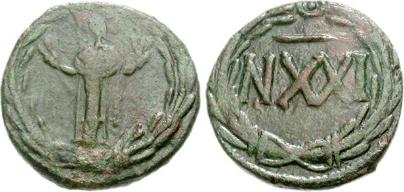 NXXI (mark of value) within laurel wreath; pellet in wreath ornament |
