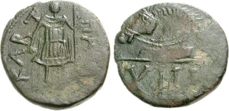 Karthago standing facing, holding three grain ears in each raised hand; all within wreath |