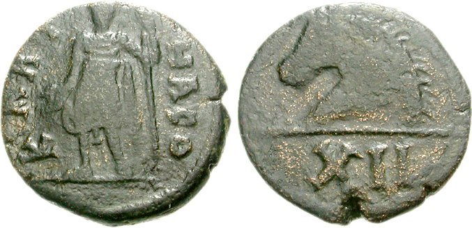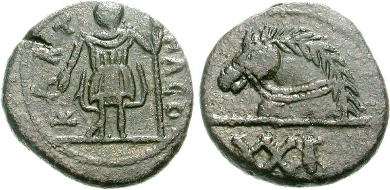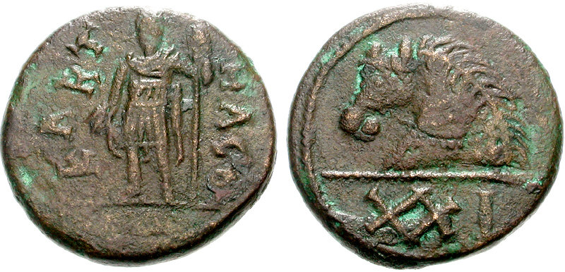 Bridled horse’s head left; XXI (mark of value) in exergue |