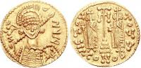 Crowned facing busts of Heraclius, with short beard, and Heraclius Constantine, beardless; cross above |