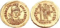 Pearl-diademed bust of Anastasius right, wearing Ostrogothic-style garment |